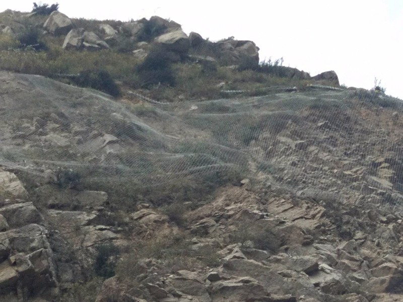 主動防護網(wǎng)是用以鋼絲繩網(wǎng)或TECCO高強度鋼絲格柵網(wǎng)為主的各類柔性網(wǎng)覆蓋或包裹在需防護的斜坡或危石上,以限制坡面巖土體的風化剝落或破壞以及危巖崩塌(加固作用),或者將落石控制在一定范圍內(nèi)運動(維護作用)。